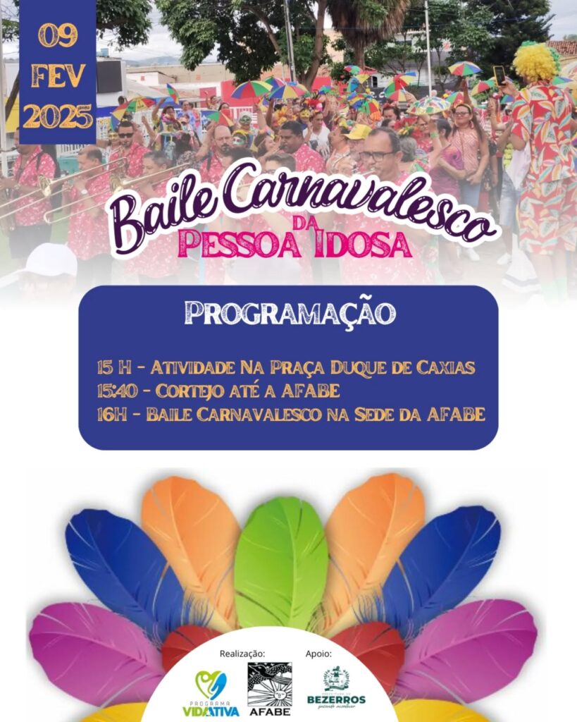 9° Baile Carnavalesco da Pessoa Idosa em Bezerros! PARTICIPE! Organizamos uma programação maravilhosa para vocês. Inicialmente, teremos as atividades do @vidaativa60mais na praça Duque de Caxias com @josiivvan , em seguida a turma animada sairá da praça em cortejo até a sede da AFABE onde ocorrerá o 9° Baile Carnavalesco da Pessoa Idosa. Muita Energia, Alegria e descontração com a presença de Orquestra de frevo para animar a turma no baile. Está festa será incrível.